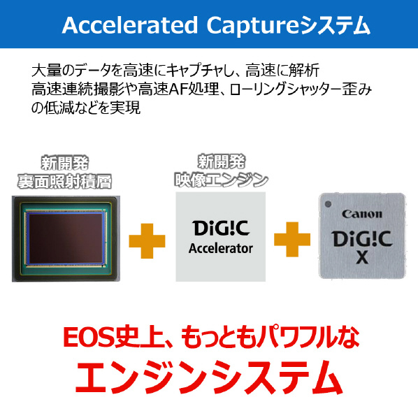 ・従来の映像エンジンに加え、センサーから読み出した大量のデータを瞬時にキャプチャし、解析する新開発の映像エンジンDIGIC Acceleratorを搭載。